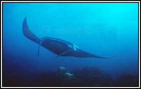 Related to the shark, the manta ray is a fish that cruises the waters with the grace of angels descended from heaven. I had occasion to go belly to belly with one that made me look awfully small and feel very vulnerable. The giant rose from the depths, mouth gaped so I could look into the wide hatch, big enough to swallow me. I clutched the floating ring and bobbed in the choppy waves, spread eagle on the surface. Just before the manta reached me, in slow motion he rolled over exposing five pairs of gills on the white underside. His belly splattered with a pattern of black marks as distinctive to him as my figure prints are to me was less than three feet away from my belly. An experience almost too surreal.